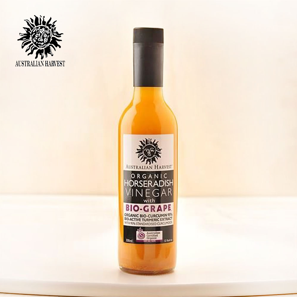 AUSTRALIAN HARVEST Organic Horseradish Vinegar With Bio-Grape – 350ml is a delicious healthy salad dressing made with a base of organic unfiltered raw apple cider vinegar with added organic BIO-GRAPE BIO-CURCUMIN 95% bio-active turmeric extract, Organic Horseradish, Organic Garlic, Organic BIO-CAYENNE cayenne pepper extract and BIO-GRAPE (Grape Seed Extract).