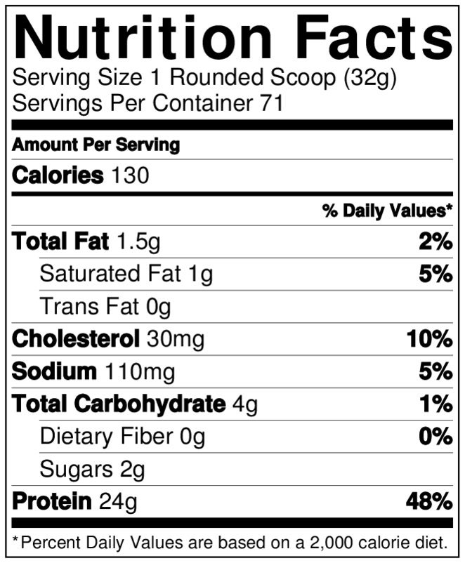 Suggested Use as a dietary supplement, mix 1 heaping scoop of 100% Whey Protein with 4-8 ounces (depending on desired consistency) of water, skim milk or your favourite beverage. Consume 1-3 servings daily or use as recommended by a physician or licensed nutritionist
