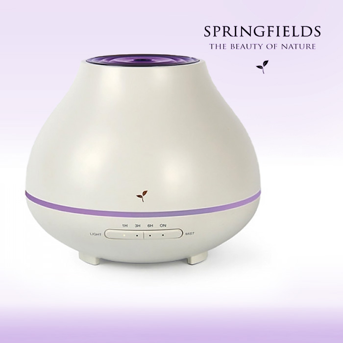 Springfields Ultrasonic Diffuser retains the integrity and purity of essential oils by using ultra sonic vibration, rather than heat, to dispense the therapeutic and ambient benefits of aromatherapy. It works by breaking essential oil molecules down into micro molecules and then diffuses them into the air as negative ions; helping to purify the air. Once the essential oil molecules are dispersed into the atmosphere, they are easily inhaled and absorbed, infusing the room with a pleasant, naturally healthy aroma. Springfields Ultrasonic Diffuser is a safe, easy way to enjoy the benefits of aromatherapy. It stays cool to the touch, so it is safe for the entire family, and suitable for use in children’s bedrooms. To use, simply add to 6 -10 drops of your chosen essential oil or essential oil blend to the water chamber of the Ultrasonic Diffuser, and press the ‘ON’ switch to instantly infuse your space with aromatic mist.