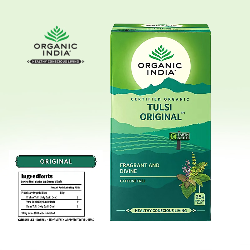 Three sacred varieties of Tulsi with restorative powers are blended to create this deliciously calming, yet energising infusion of Tulsi Original tea. With hints of lemon and citrus from Vana Tulsi, the slightly spicy tones of Krishna Tulsi and the calm depth of Rama Tulsi this tea infusion will help relieve stress and uplift your mood.